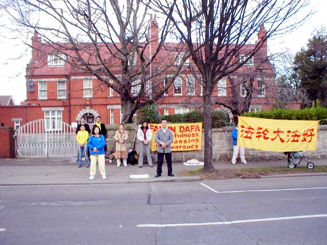 【明慧网2004年2月15日】得知近期中国大陆传来更多法轮功学员被非法拘捕,遭受酷刑折磨甚至被虐杀的消息,2月13日下午,爱尔兰大法弟子在中领馆前打出“法轮大法好”“法办江泽民”,“法办罗干”“法办刘京”“法办周永康”的横幅。要求法办策划迫害法轮功学员的罪魁祸首江泽民(中共中央军委主席、原中共中央总书记、中国国家主席)、及罗干(中央政治局常委、中央政法委书记),刘京(中国公安部副部长、中央610办公室副主任)及周永康(中国公安部部长)等助纣为虐的帮凶。并呼吁社会各界正义人士共同抵制和揭露大陆各地不法之徒迫害大法弟子的恶行。