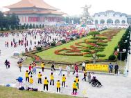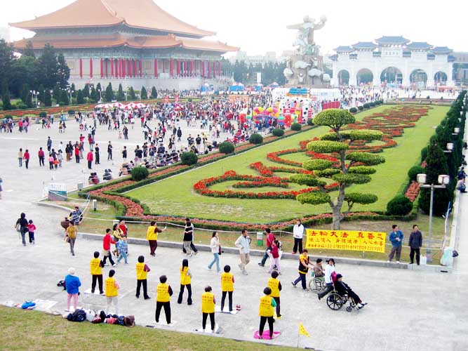 | 学员在中正纪念堂前炼功、洪法 | 让更多游人了解法轮功真象 |