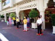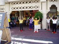 学员们在热闹的Myre Department Store 前示范功法学员向路人介绍法轮大法