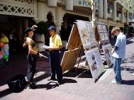 【明慧网2004年2月21日】炎炎的夏日,住在西澳柏斯的人们外出通常只有两个选择 – 清凉的海滩或市中心购物。而上星期天很多选择到市中心的人是有福的。因为那天西澳法轮功学员们在那里洪法讲真象。