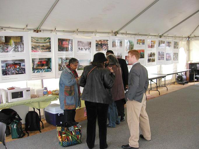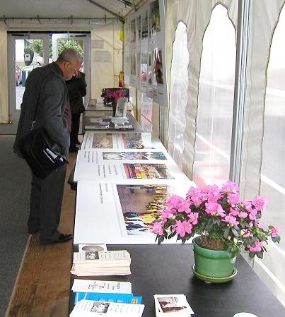一整天都在进行的图片展也吸引了许多政府工作人员前来参观、签名。人们在品尝中国式点心的同时,向学员提出了许多问题。一位女士在看完图片展之后,感动得一定要捐款。学员向她表示感谢并说明了法轮功不接受钱物的原则。