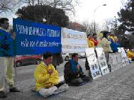 学员们在中使馆前打出“法轮大法好”和“停止迫害法轮功”的横幅以及“法办江、罗、刘、周”的标语牌,向过往行人发放真相传单,过往行人纷纷停下脚步,当人们看到被迫害致死和致伤的法轮功学员的图片,非常震惊在中国发生的迫害罪行。有一位信天主教的女士在了解了真相后对我们说:“我是一名天主教信徒,每一个人都应该有信仰的自由。”人们非常关切在中国受迫害的法轮功学员的处境,问“我们能为你们做些什么?”还有不少人祝我们好运,祝法轮功成功。