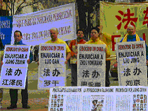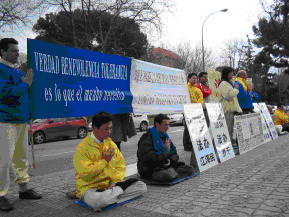 【明慧网2004年2月24日】近日中国江集团加剧迫害法轮功,被迫害致死的法轮功学员的人数骤然上升,部分西班牙法轮功学员来到中国驻西大使馆前抗议江集团虐杀法轮功学员的恶行,强烈要求法办恶首江泽民及其邪恶帮凶罗干、刘京、周永康。并呼吁国际社会关注和共同抵制江氏集团针对法轮功学员不断升级的迫害罪行,法办首恶分子。
