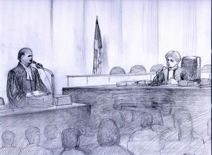 法庭速写:原告律师伯格曼(左)向法官(右)做当庭结案陈词