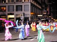 法轮功第一次参加旧金山庆新年大游行,倍受瞩目。学员们在游行出发地点排练时就有大批的媒体围观,不停地拍照。一路上,法轮功的队伍获得了热烈的欢迎。队伍中有七仙女舞、彩灯舞、扇子舞、腰鼓队和花车。祥和的音乐,绚丽多彩的服装和优美的舞姿,不断获得市民们的掌声。观众通过花车上的功法表演和“法轮大法好”、“真善忍”、“世界需要真善忍”等横幅看到了法轮功的风范。