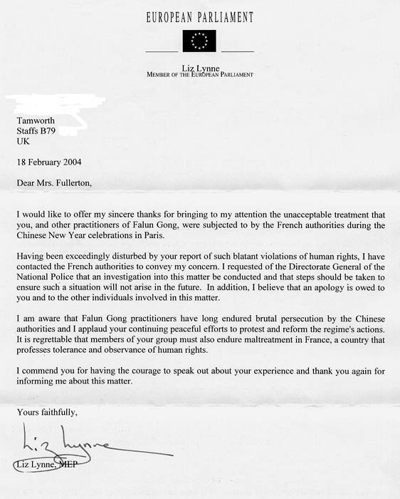 衷心感谢你使我关注你和其他法轮功学员在巴黎中国春节庆祝活动中所遭受到的来自法国当局的不可接受的对待。