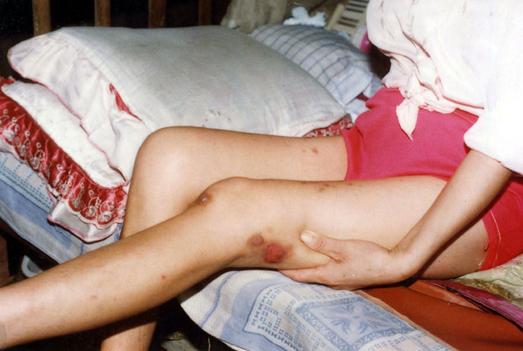 被迫害时被电棍烫得满身水泡,后变成黑色,两个月后留下的疤痕