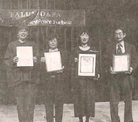 图片说明:市长马吉-赫丽罕女士(左)和三位法轮功学员手持当地政府官员颁发给法轮大法的褒奖状。