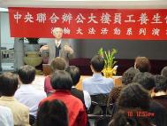 【明慧网2004年3月12日】3月10日,台北中央联合办公大楼员工举办第一场“员工养生保健运动—法轮大法活动系列演讲”,邀请法轮功学员胡乃文中医师演讲「世纪瘟疫危机?健康养生之道」。除提供专业保健观念与方法外,胡医师还现身说法分享修炼法轮功后的心得与体验,并现场义诊。与会听讲员工近百人,反应热烈,个个显得轻松自在。