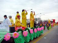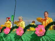 | 花车上的功法表演 | 法轮功游行队伍 |