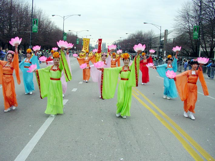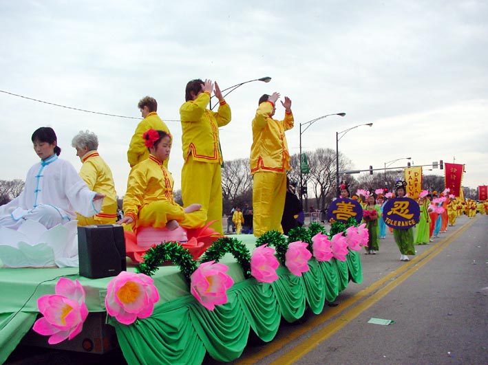 游行当天,来自密歇根州,印第安纳州,密苏里州和伊利诺州的法轮功学员们组成了一支由绿色的花车、仙女荷花舞蹈方阵和腰鼓方阵的的游行队伍,走在队伍最前面的是学员们亲手制作的印有“法轮大法”和“真善忍”的木匾。在游行还没有开始之前,就有很多其他方阵的和观看的民众前来和学员们合影,学员们也同时向他们介绍法轮功以及目前在中国发生的对法轮功的残酷迫害。一位游客开始好奇的询问这是什么队伍,当他得知是法轮功的队伍并听了学员更多的介绍后,说:“哦,我知道你们,加油加油!”