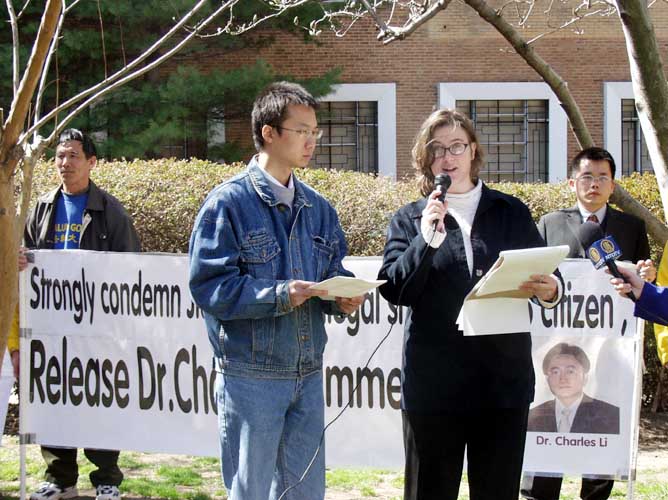 在集会上,来自马里兰州的范娅姑女士说:我不炼法轮功,但我57岁的妈妈却因为修炼法轮功连续三次被捕,我知道妈妈是个人人称道的好人,现在仍被关押在郑州市公安局第一看守所,生死不明。为了我的母亲,也为了所有法轮大法修炼者,我们一定要把那些(中国)邪恶的政府,公安向各国媒体曝光!把他们剥夺和践踏人权的丑闻公诸于全世界!她含泪恳求美国政府,善良的民众伸出援手,帮助营救她在中国被迫害的母亲和所有被迫害的法轮功学员。