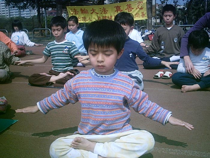 户外集体炼功也是不可少的活动。既让小弟子们炼了功,又可以帮助有缘人认识大法。小弟子们有序地排好队,一路浩浩荡荡地走到篮球场旁,在太阳底下有板有眼地盘起腿来。虽然那天太阳很大,小弟子们个个汗流浃背,但大家都能坚持到结束。
