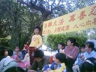 炼完功后,小弟子们沿路走回教室时,还不忘发简介给前来打球的民众。他们天真、乖巧、聪慧的模样,令许多路过的大人们吃惊,纷纷过来询问这是什么团体。我们正好随手奉上一份简介,并真诚地和他们分享孩子们学炼法轮功后的改变。当他们得知这洪传六十多个国家及获得1000多个褒奖的好功法在中国大陆持续四年多被残酷迫害的真象时,无不对迫害发出正义的谴责之声。