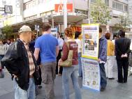 曾因向中国民众讲法轮功真象而被北京警察抓捕并关押一年半的法轮功学员金子容子来到这里向人们致谢。容子被关押在中国期间,为援救容子的征签活动中,有半数以上的静冈县议员伸出援助之手,这里更多善良的民众也配合整个营救活动。容子致谢的同时,也讲述了在中国劳教所里遭受的迫害,一些路人停下脚步观看看板,一些人得知容子回来了,露出了欣慰的笑容。