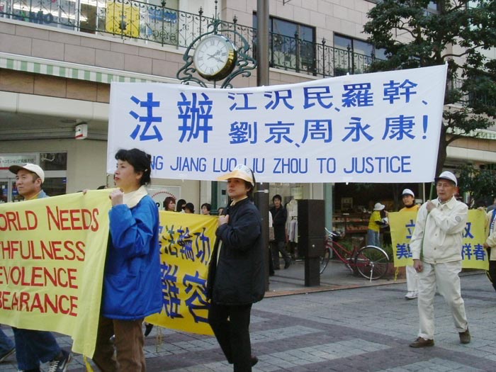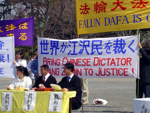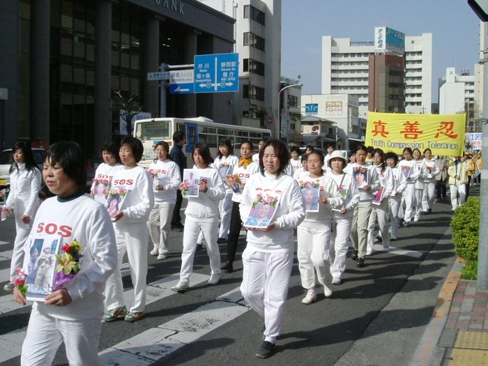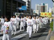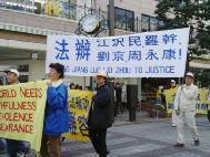法轮功学员来到静冈县古城遗址骏府公园,首先是炼功,而后是审江大集会。中午休息之后,是反对江氏集团迫害法轮功的游行及在繁华街道演讲同时进行。