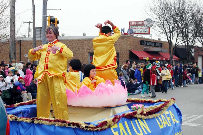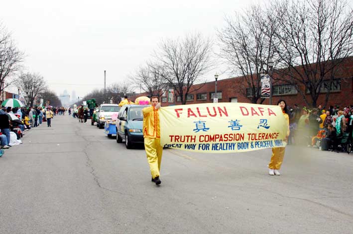13日星期六,对于生活在北堪萨斯城附近的居民来说(North Kansas City)一年一度的圣派屈克节游行已是20年来的传统活动,大约100多个团体参加了游行,观众数万名。今年,是法轮功学员首次来这里参加游行。