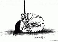 2. 2002年12月初, 恶警李瑞民找来了广州市第一劳教所二大队的恶警李国民和黎伟成,发明并亲自动手实行一种新的酷刑(如右图):把学员双腿盘起,两膝并拢捆紧,双手反背后再使劲上拉捆住后,再与两肩相捆绑,然后把上身压在盘着腿上一并捆绑,头朝下垂在两膝间捆成一团,最后用吊在天花板上的布条吊起捆在背后的双手,把身体拉至刚刚着地的角度。随后,恶徒们就丧尽天良地一边骂,一边把法轮功创始人的照片塞进女学员的上、下身的衣、裤内,动作极尽下流。在这样的酷刑下,被绑者的全身钻心地剧痛,呼吸困难,身体发紫,手甚至伤残,生不如死。这时行恶者还叫嚣着: “我们帮你炼功,帮你上层次,绑你是为你好!”天下竟有如此无耻之徒!恶警李瑞民还指使打手把法轮功创始人的名字用漆喷在监仓的厕所坑里、地上、床上,以此来从精神上折磨人。