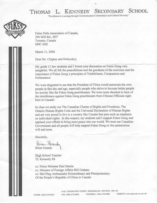 在课堂上,我们学习了加拿大自由权利宪章(The Canadian Charter of Rights and Freedoms),安大略省人权法(Ontario Human Rights Code)和世界人权宣言(Universal Declaration of Human rights),我们为我们生活在象加拿大这样一个强调尊重个人权利的国家而感到骄傲。因此,我和我的学生支持法轮功,并为你们给世界带来更多的和平所做的努力而喝彩。我们相信我们的加拿大政府和全体人民将会支持法轮功,以使这场迫害早日停止。