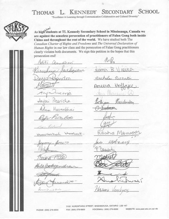 加拿大托马斯-肯尼迪高中师生联名要求停止迫害法轮功