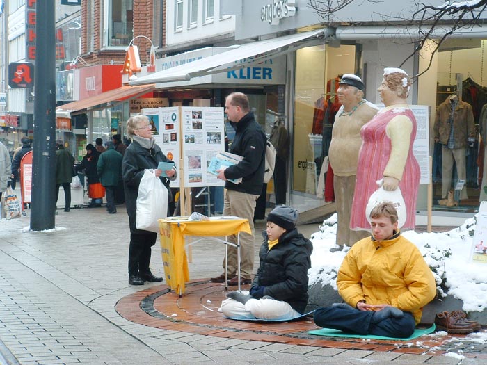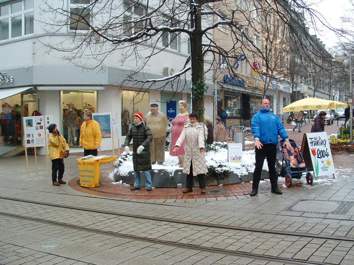 虽然天气有些冷,但还是有很多人停下去购物的脚步观看功法表演。一个德国人还当场学了功。一名俄罗斯裔的学员的语言特长派上了用场,他和一名俄罗斯女士谈了很久,这位女士深深被法轮功吸引,也想学功。学员们还准备了介绍法轮大法的色泽鲜艳的书签和明信片,孩子们尤其感兴趣。