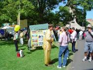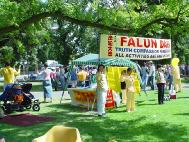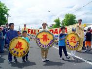 | 小弟子手持“真善忍”走在游行队伍的最前面 | 扇子舞和红绸舞表演 | 法轮大法的展示摊位 |