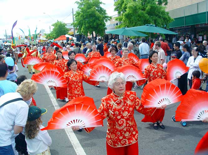 在当日的游行中,来自不同国家的移民穿着传统民族服饰的歌舞表演,引来观众的阵阵掌声,主要由华裔人士组成的法轮功团体在游行中非常引人注目。