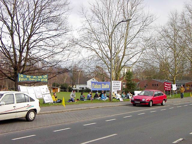 在2004年2月24日来自波恩、科隆、法兰克福、海德堡和达尔姆市的修炼者在驻波恩的中领馆前聚集,他们在此平和地炼功并向路人分发讲清真相的传单。