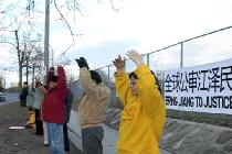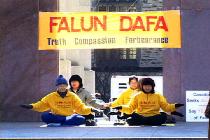 | 法轮功学员在渥太华人权纪念碑下炼功 | 法轮功学员为在中国被迫害致死的同修烛光守夜 |