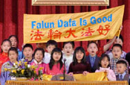 大纽约地区明慧学校的小弟子上台背诵了数首师父《洪吟》中的诗篇。背诵结束后,小弟子们打出中英文「法轮大法好」横幅,并用中、英、俄、西班牙等五种语言大声说「法轮大法好」。