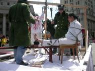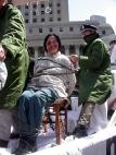 “警察还用几根高压电棍同时电击他身体的敏感部分,例如头、颈、胸部等等,被电击处皮肉烧焦,全身猛烈颤抖,整个身体仿佛被放在火中烤,仿佛被毒蛇叮咬。有一次,警察指使同室十多名犯人毒打他,使他的脸都变了形,然后把他的脚和腿紧紧地捆绑起来,把两只胳膊捆到背后,再把他的脖子和腿紧紧地捆在一起,使他几乎窒息,然后把他塞到床底下,在床板上坐上人,使劲往下压他的背,当时他感觉他的骨头都要断裂,这以后他有两个星期不能行走。另一位名叫鲁长军的学员在这种同样的酷刑后瘫痪了。