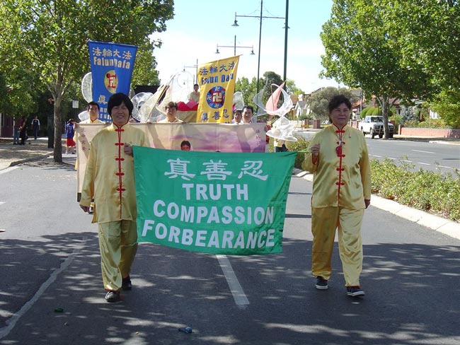 【明慧网2004年4月15日】地处澳洲维多利亚省中部的班迪戈镇每年都要在复活节举行一次盛大的地方节庆。已成功举办134年的班迭哥节,为澳洲历史最悠久的节庆。2004年3月12日,来参加该节日游行的近百名法轮功学员怀着祥和、纯净的心态向近20万善良淳朴的观众展示了法轮大法的美好及其在世界范围内的洪传。