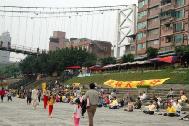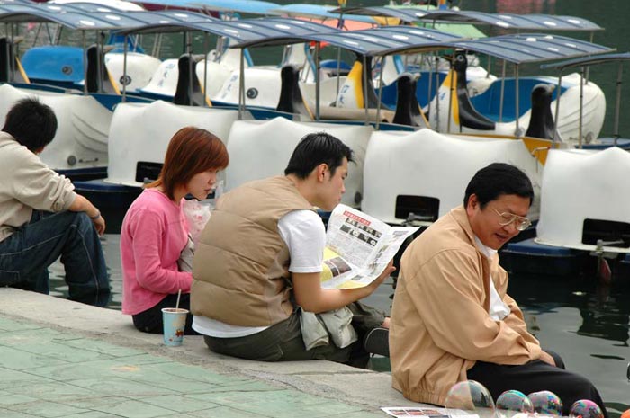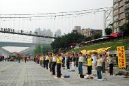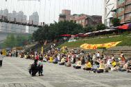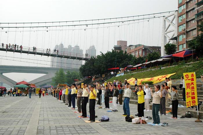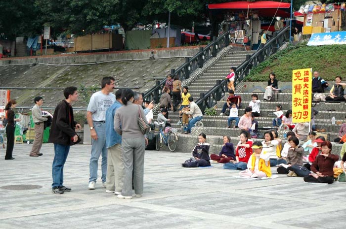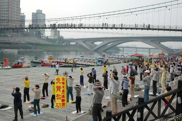 【明慧网2004年4月16日】(明慧记者陈佳郁台北报导)连绵的雨季刚过,台北的天空透出暖意的阳光,2004年4月10日周末午后,约200名法轮功学员至台北新店市著名景点--碧潭(碧潭东岸河滨公园)举办集体炼功洪法活动,许多民众携家带眷到此游湖休憩,湖光山色中的祥和炼功动作和优美的炼功音乐,吸引了人们的目光。