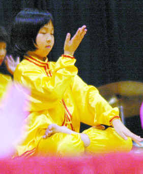 【明慧网2004年4月20日】堪萨斯星报4月18日报导说,星期六在北地(Northland)举办的第一届多元文化节上,8岁的小女孩洛伊斯-邝(Lois Kuang)表演了法轮大法的功法。