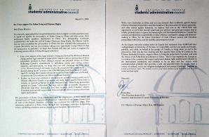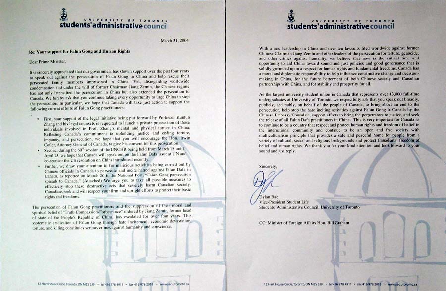 作为加拿大最大的大学学生会,我们代表多伦多大学的四万三千本科学生,尊敬的要求您代表加拿大人民,高尚的、公开的呼吁,帮助制止这场迫害,帮助停止中国驻加使领馆在加拿大進行的反法轮功的仇恨宣传,协助将迫害者绳之以法,要求释放所有中国的法轮功学员。这一点对于加拿大继续在国际社会中保持尊重保护人权和信仰自由的国际形像极为重要,体现出加拿大作为一个为来自不同文化,社会,宗教背景的人民提供安全,和平,开放,自由的多元文化社会和保护加拿大人信仰自由和基本人权的重要特色。我们非常感谢您的关注并期待着您的回复。