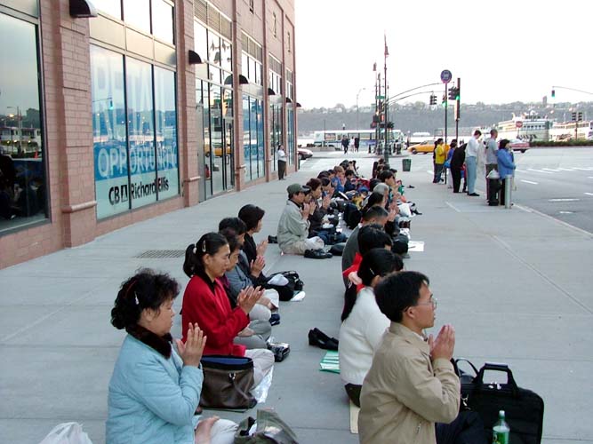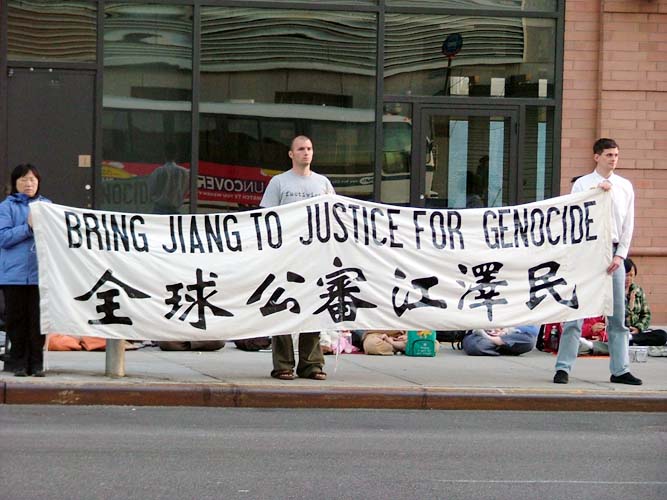 纽约法轮功学员们在领馆前立了四个醒目的横幅:“薄熙来,追随江××迫害法轮功,难逃历史的审判”,中英文“全球公审江泽民”,“法轮大法好”和英文“中领馆停止迫害法轮功”。下班期间,车辆川流不息,学员静静炼功的场面肃穆庄重。