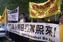 2004年4月22日傍晚,在由包括中国副总理吴仪和中国商务部长薄熙来在内的中国贸易代表团在位于美国华盛顿DC的Fairmont Hotel举行餐会之时,法轮功学员在酒店外和平请愿展示真象,并呼吁立即驱逐人权恶棍薄熙来。