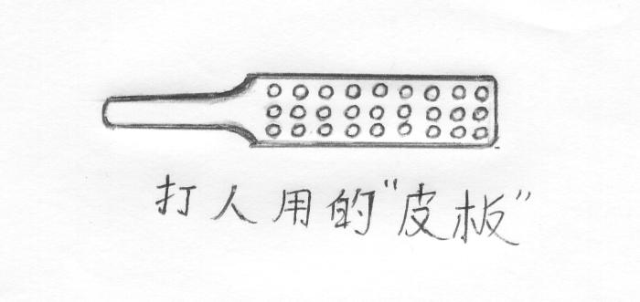 “皮板”是用橡胶皮宽带制作的,有个手柄,“皮板”上还有一排排又大又亮的铆钉(铁疙瘩)。(大意形状见下图)