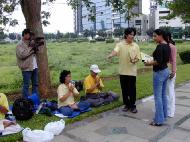 一位警察说,他是奉命前来巡察,因为他的上司接到中国大使馆的抗议。他说,他对这群屡次在使馆面前静坐的法轮功学员相当熟悉,这群人顶着寒雨酷暑,总是依照协定时间做事,没有叫喊声,只有小录音机播放出来的炼功声带,他们示范炼功动作,到点后全部人员自动解散,活动过后的场地也没看到任何垃圾或饮品罐。