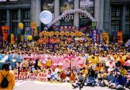 可是没关系,因为我们大法弟子,是不分你我一起证实大法的。当天我们一路穿越了中国城,路上行人不管是黄种人或西方人不时给我们很多掌声,还有学员拿着自制的纸莲花与小花送给道路两旁的行人,希望藉由清净的花朵将大法的美好带给所有的人。到达终点时学员们群聚在一起,那天晴空万里天空照耀着柔和温暖的阳光,学员们穿着自制的各式各样舞蹈服装,手中拿着自制的大法旗帜,一幅幅颜色鲜艳且字体不同的“法轮大法好”,煞是好看!学员中有台湾、日本、美国、韩国、香港等等,更有远从欧洲来的,大家抱着景仰虔敬的心一起向师尊问好!当时,我就站在喷水池上,拍下了这张殊胜壮丽的图片!