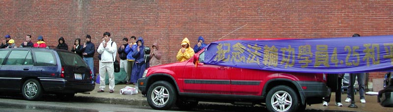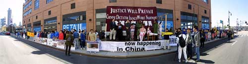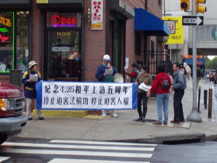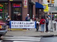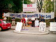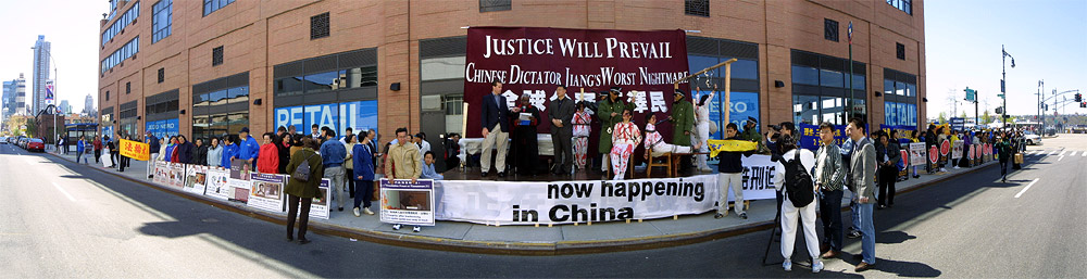 4月24日下午,大纽约地区大法弟子在中领馆前集会,展示4.25上访的历史和法轮功在5年中遭受的迫害。同时模拟审判江××,呼吁各界人士制止迫害。