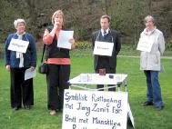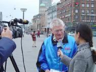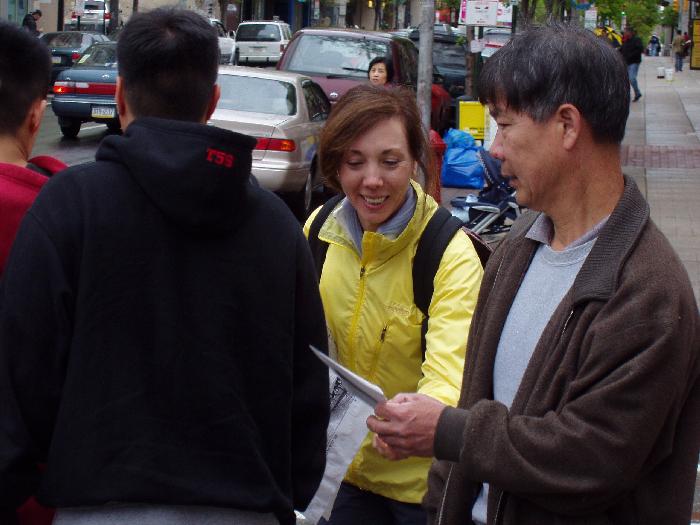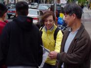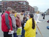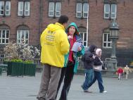 ![]() 4月25日,丹麦法轮功学员在公共广场向过往行人讲真象 | ![]() 向过往行人讲真象 |