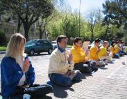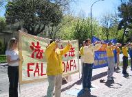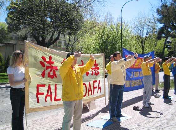 4月25日,西班牙马德里大法弟子来到中国大使馆前和平请愿、发正念、。镶有金边的“法轮大法”横幅和红黄蓝相间的“世界需要真善忍”的横幅在蔚蓝色天空的映照下格外醒目。这一天正值周末,平日里的周末,这里行人十分稀少,然而这次却不同,过往行人很多,并且立即被法轮功学员们庄严、肃穆、和平的场面所吸引。当人们得知真相后,纷纷签名声援,有的人接过传单边走边看,当看明白是怎么回事之后又返回来要求签字并问学员怎样才能更好的帮助法轮功学员……