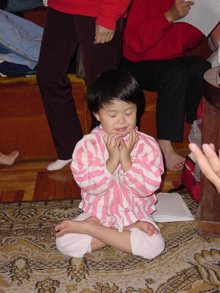 (法度)我学会了发正念:法正乾坤,邪恶全灭。我还学会了唱法轮大法好的歌。(法度唱一小段‘法轮大法好’的歌)。