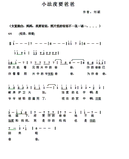 (镜头):爸爸你在哪里啊?(音乐:小法度要爸爸,女声独唱,歌声如诉如泣。)