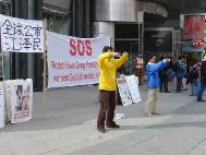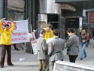 大法弟子们打出了“纪念4.25和平请愿”,“全球公审江泽民”,“把江泽民送上法庭”和巨大的以SOS为背景用德文写的“救援在中国正在遭受迫害的法轮功学员”等横幅;还准备了多种语言的传单,发给来自世界各地的观光客。许多人向大法弟子们询问想学炼功法。亦有被在中国媒体造谣蒙骗的人,在向大法弟子了解真象后重新开始认识法轮功、认识这场迫害。