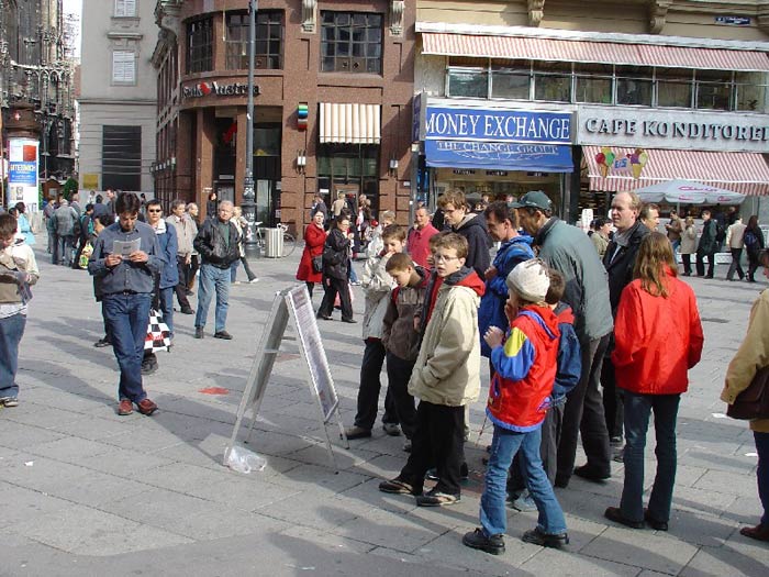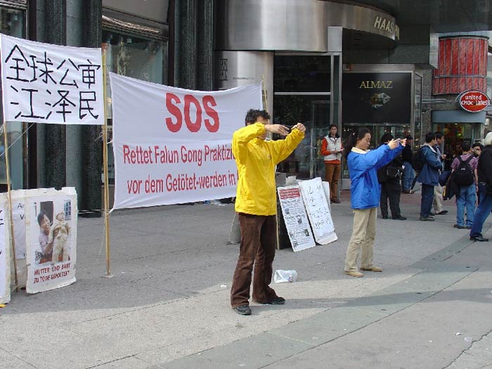 【明慧网2004年4月29日】2004年4月24日奥地利大法弟子在维也纳市中心的著名旅游景点史帝文广场,举行了为纪念“4.25”和平请愿5周年的洪法活动,向世人展示法轮大法的美好,并揭露江氏集团对法轮功学员将近5年的镇压与迫害