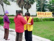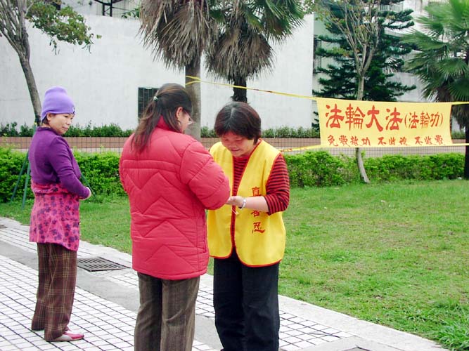 【明慧网2004年4月4日】2004年3月28日,台湾北区土城运动公园举办了一场户外法轮功功法演示及洪法活动。这次的活动虽然只有两个小时,但吸引了不少有兴趣的民众前来学炼与了解。有位民众说:常常看到你们在户外炼功,发现你们非常祥和,也多次在媒体上看到一些专家学者的正面报导,一直非常好奇,今天总算有机会接触法轮功学员,希望能进一步了解。