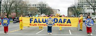 学员们的游行队伍和谐、美观,既向人们展示法轮功,又向美国社会介绍中国传统文化,深受观众喜爱,博得阵阵掌声。许多人也通过学员们的游行看到和进一步了解法轮功。在游行前的排练中,不断有人和仙女、龙等合影留念。