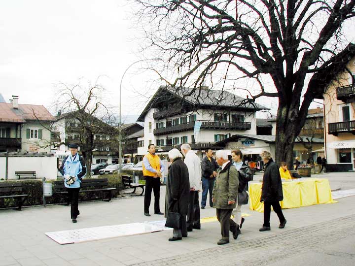 前不久有一位法轮大法弟子搬到加米施-帕藤基兴,为了让这里的人们更多的了解法轮大法(法轮功),他马上着手联系,很快就在镇中心申请到了位置。在附近城市的学员帮助下,2004年4月3日,这里顺利的举办了法轮功信息日活动。